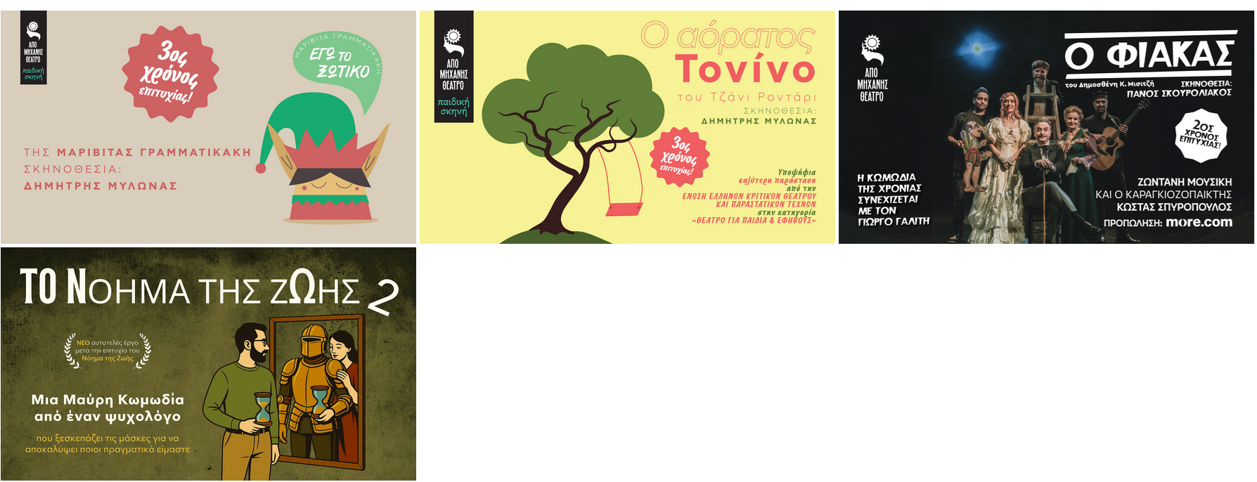 Όλες οι ΔΩΡΕΑΝ θεατρικές παραστάσεις (που ανεβαίνουν εντός και εκτός Αττικής) αλλά και εκείνες που έχουν είσοδο με ελεύθερη συνεισφορά ή με μικρή χρέωση (έως 6€) παρουσιάζονται αναλυτικά στην σελίδα: ΔΩΡΕΑΝ ΘΕΑΤΡΟ