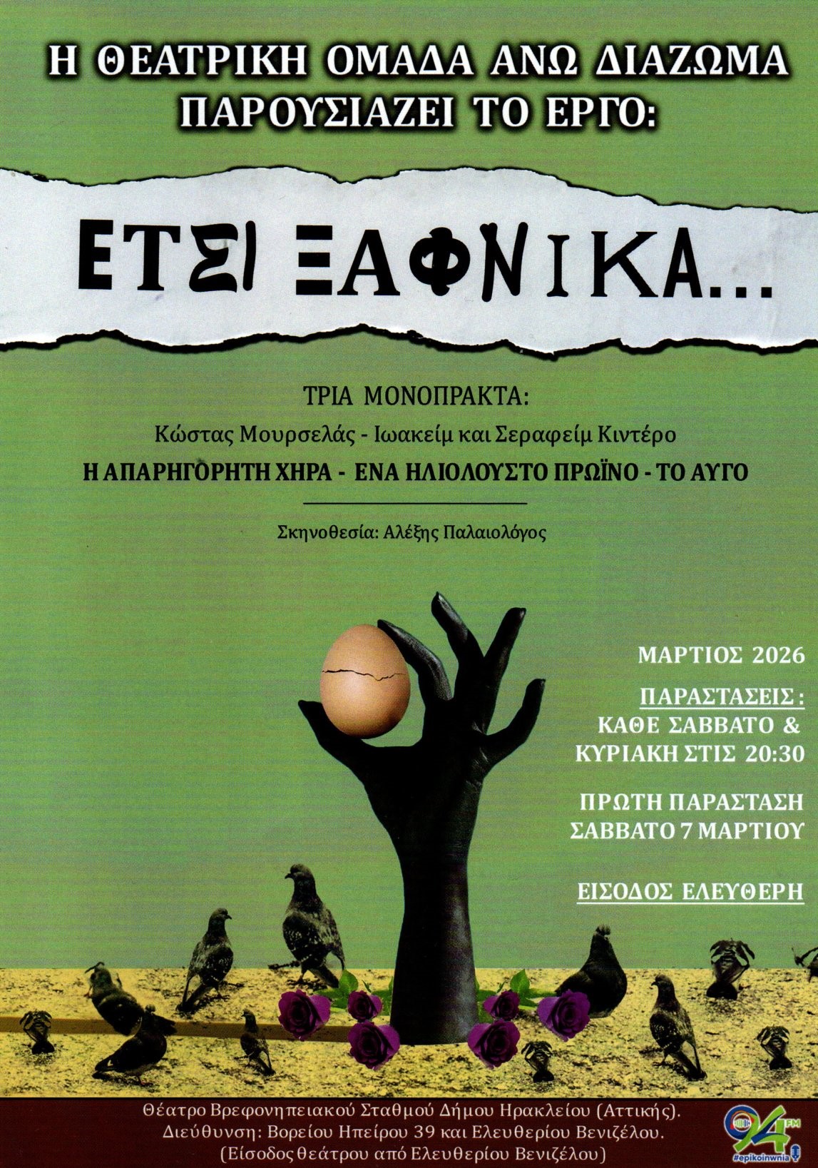 Στο κέντρο της Αθήνας, στο ιστορικό θέατρο Εμπρός (στην οδό Ρήγα Παλαμήδου 2), ανεβαίνει αρκετά ενδιαφέρουσες θεατρικές παραστάσεις. Είσοδος με ελεύθερη συνεισφορά. Πηγή: facebook