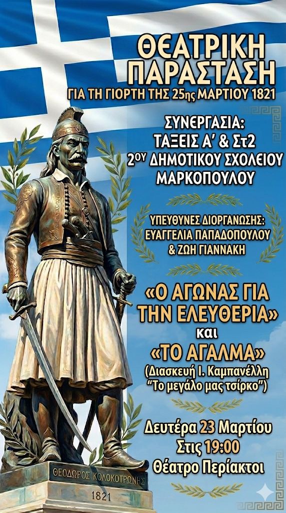 Ο Δήμος Βάρης Βούλας Βουλιαγμένης, στο πλαίσιο των εκδηλώσεων για τον εορτασμό της εθνικής επετείου της 25ης Μαρτίου, παρουσιάζει τη θεατρική παράσταση «Θεόδωρος Κολοκοτρώνης: Ο Θεός έβαλε την υπογραφή του» του θεατρικού συγγραφέα Γιώργου Α. Χριστοδούλου. Η παράσταση θα πραγματοποιηθεί την Τρίτη 24 Μαρτίου στις 20.00 στο Πολιτιστικό Κέντρο «ΙΩΝΙΑ» (Λεωφ. Κ. Καραμανλή 18, Βούλα), προσφέροντας στο κοινό μια ξεχωριστή θεατρική εμπειρία αφιερωμένη σε μία από τις σημαντικότερες προσωπικότητες της Ελληνικής Επανάστασης. Είσοδος ελεύθερη. Πηγή: xpress-news.gr