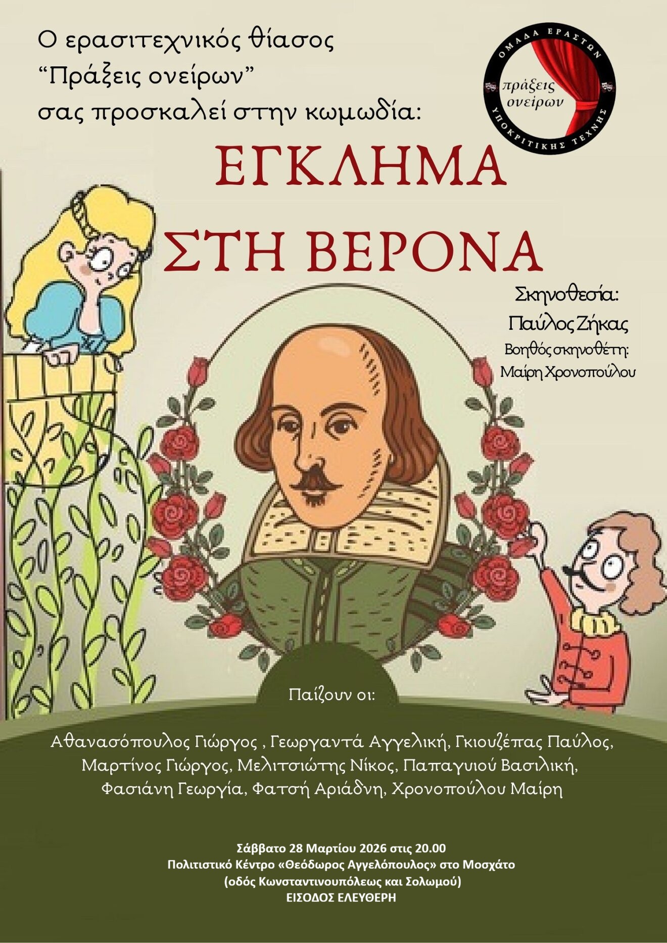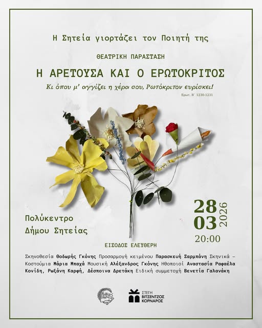 Η Στέγη ΒΙΤΣΕΝΤΖΟΣ ΚΟΡΝΑΡΟΣ, σε συνδιοργάνωση με τον Δήμο Σητείας, διοργανώνει στις 27 και 28 Μαρτίου 2026, στη Σητεία, ένα διήμερο πολιτιστικών εκδηλώσεων με τίτλο «Η Σητεία γιορτάζει τον ποιητή της», αφιερωμένο στον μεγάλο δημιουργό της κρητικής αναγέννησης Βιτσέντζο Κορνάρο, με αφορμή την επέτειο των γενεθλίων του. Στα πλαίσια των εκδηλώσεων το Σάββατο 28 Μαρτίου στις 20.00 θα παρουσιαστεί η θεατρική παράσταση: «Η Αρετούσα και ο Ερωτόκριτος», παραγωγή της Στέγης ΒΙΤΣΕΝΤΖΟΣ ΚΟΡΝΑΡΟΣ, βασισμένη στον Ερωτόκριτο του Βιτσέντζου Κορνάρου, σε σκηνοθεσία ΘΟΔΩΡΗ ΓΚΟΝΗ. Είσοδος ελεύθερη. Πηγή: fb