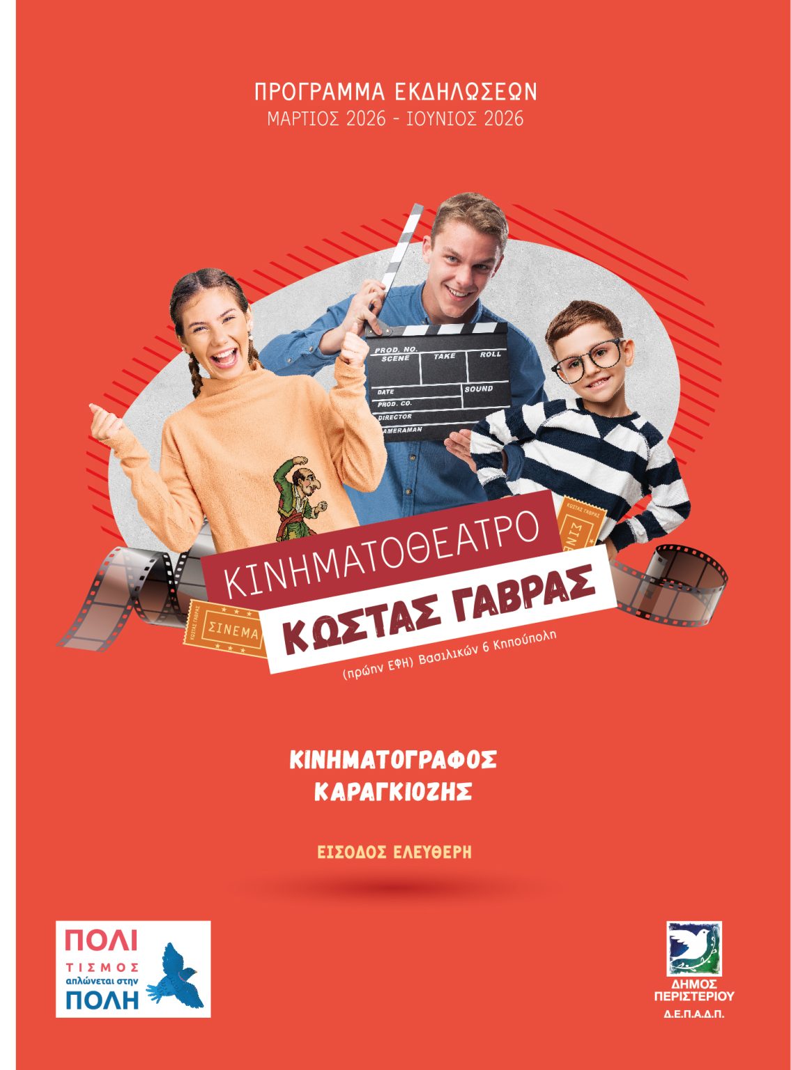 Ο Δήμος Ηρωικής Πόλης Νάουσας, με αφορμή την Παγκόσμια Ημέρα Θεάτρου (Παρασκευή 27 Μαρτίου 2026), αναλαμβάνει μια ξεχωριστή πολιτιστική πρωτοβουλία, διοργανώνοντας έναν μαραθώνιο Κινηματογραφικών προβολών θεατρικών παραστάσεων, αφιερωμένο στην τοπική δημιουργία και τη θεατρική έκφραση. Οι προβολές θα πραγματοποιηθούν την Παρασκευή 27 Μαρτίου, από τις 17:00 και έπειτα, στην αίθουσα «ΕΡΙΑ» του Πολυχώρου Πολιτισμού «Χρήστος Λαναράς». Αναλυτικό πρόγραμμα προβολών: *17:00 – «Ο Μπακαλόγατος», των Χρήστου & Γιώργου Γιαννακόπουλου – Εφηβικό τμήμα «Το Θεατράκι της Νάουσας». *18:30 – «Τρόμος και αθλιότητα του Τρίτου Ράιχ», του Μπέρτολτ Μπρεχτ – «Αίρεσις». *20:30 – «TOC TOC», του Λοράν Μπαφί – «Ερασ-Τέχνες». *22:00 – «Δεν είναι αυτό που νομίζεις», του Γιάννη Καραμπέλκου – «Το καρπούζι». Είσοδος ελεύθερη. Πηγή: fb