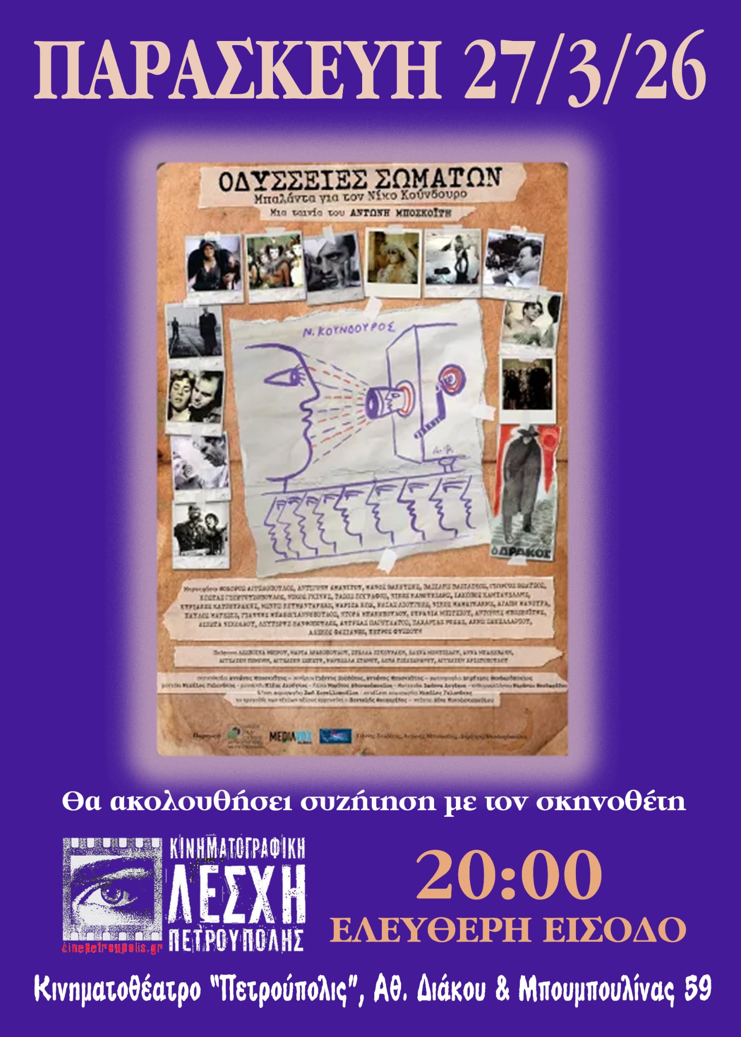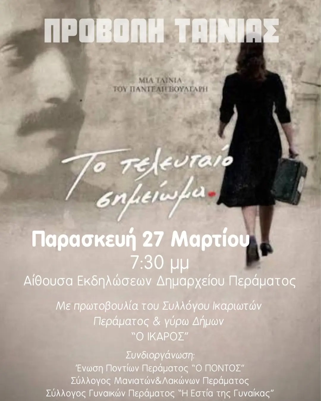 Σάββατο 28 Μαρτίου 2026, στις 19:30, στην Ταινιοθήκη της Ελλάδας, παρουσία του σκηνοθέτη Σταύρου Ψυλλάκη. Οι προβολές είναι με ελεύθερη είσοδο, με σειρά προτεραιότητας.