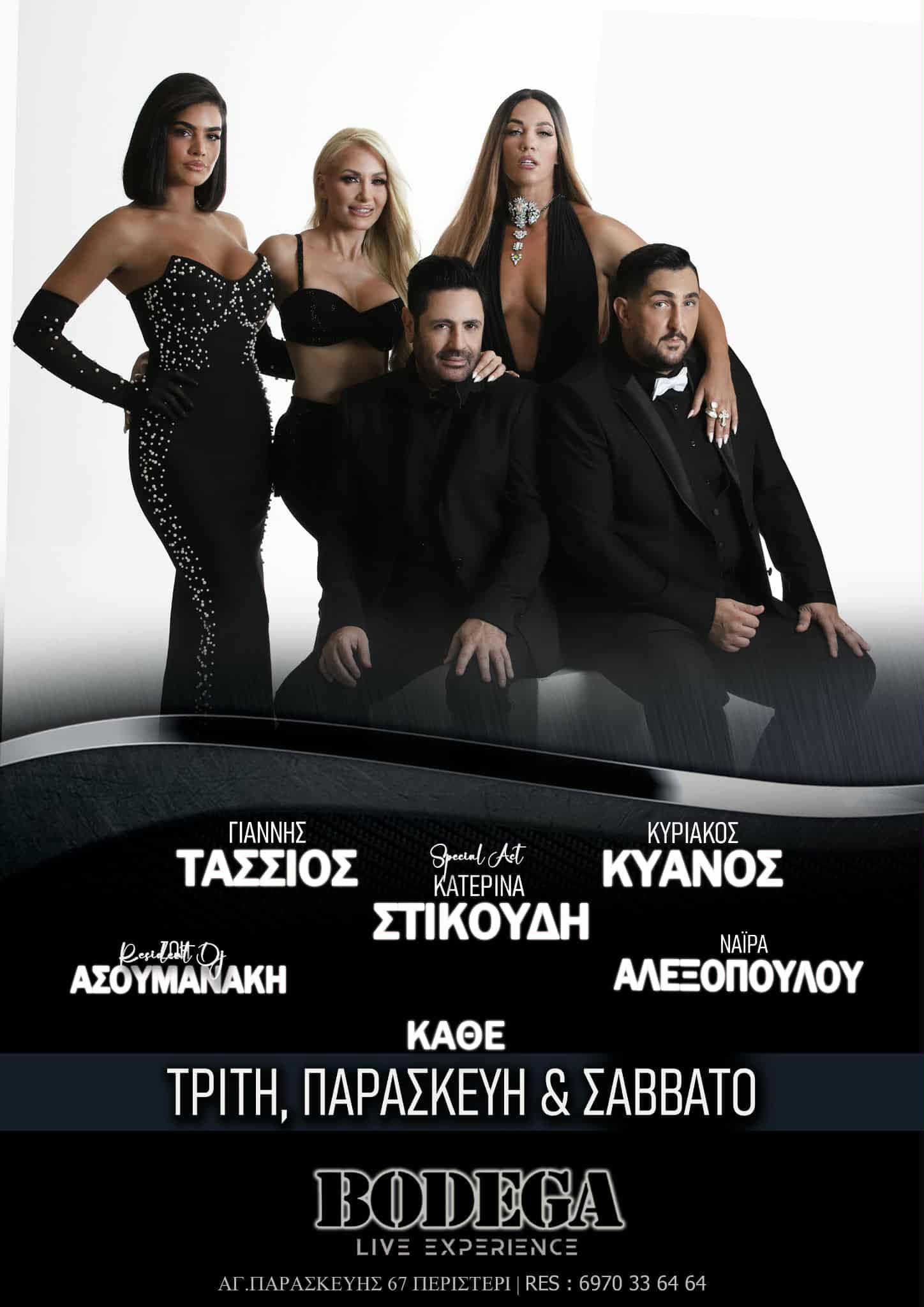 Στην οδό Αγίας Παρασκευής 67 στο Μπουρνάζι, το Bodega (η σελίδα ανοίγει μέσω facebook) παρουσιάζει τους: Γιάννη Τάσσιο, Κατερίνα Στικούδη, Κυριάκο Κυανό κάθε Τρίτη, Παρασκευή και Σάββατο!