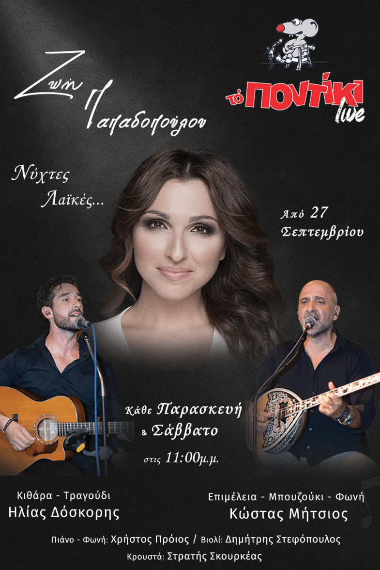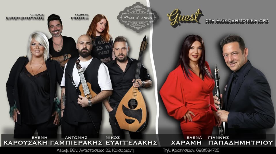 Το Meze d’ music μουσικό μεζεδοπωλείο, στην οδό Εθνικής Αντιστάσεως 23-25 στην Καισαριανή, παρουσιάζει την Ελένη Καρουσάκη, την Έλενα Χαραμή και τον Άγγελο Χριστόπουλο, κάθε Σάββατο βράδυ και Κυριακή μεσημέρι.