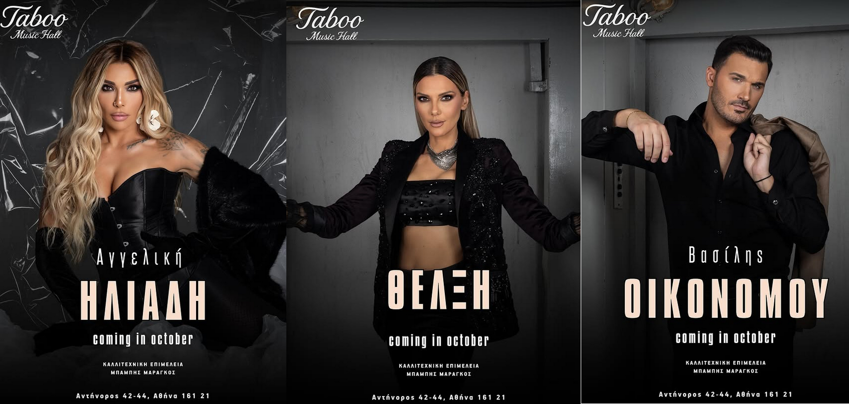Στην οδό Αντήνορος 42 στην Αθήνα, βρίσκεται το Taboo Music Hall (η σελίδα ανοίγει μέσω instagram). Κάθε Τετάρτη, Πέμπτη και Σάββατο εμφανίζονται οι: Αγγελική Ηλιάδη, Βασίλης Οικονόμου και Θέλξη.