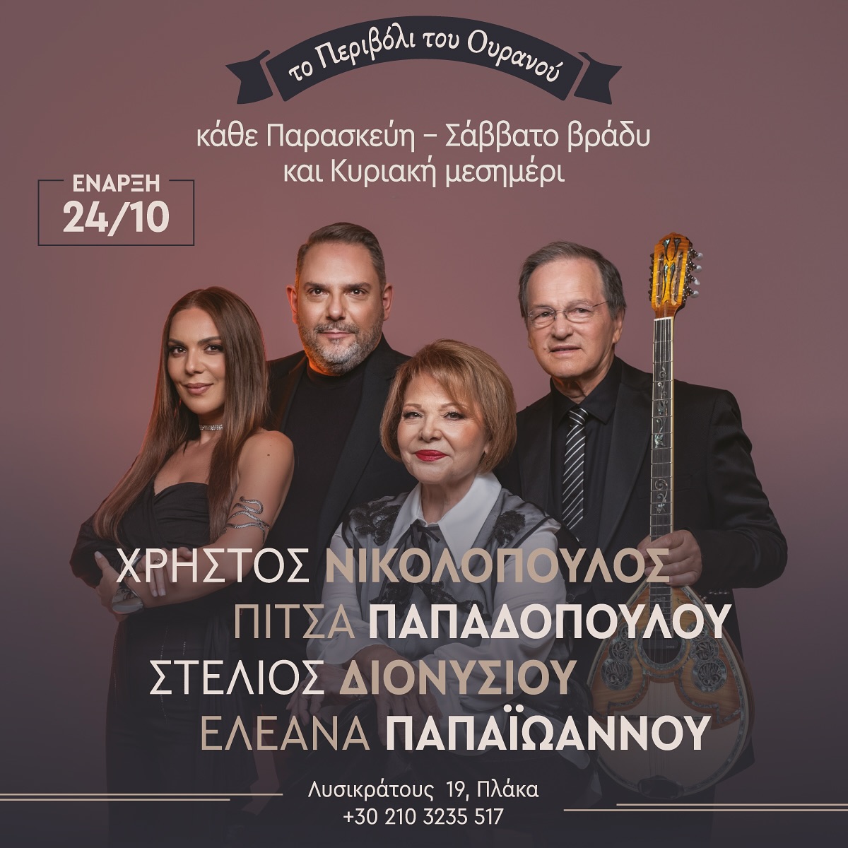 Στην Πλάκα, στην οδό Λυσικράτους 19 & Λεωφ. Αμαλίας 50 βρίσκεται το Περιβόλι του Ουρανού (η σελίδα ανοίγει μέσω facebook), όπου εμφανίζεται η Πίτσα Παπαδοπούλου, ο Στέλιος Διονυσίου, η Ελεάνα Παπαϊωάννου και ο μοναδικός Χρήστος Νικολόπουλος. Κάθε Παρασκευή & Σάββατο βράδυ και Κυριακή μεσημέρι.